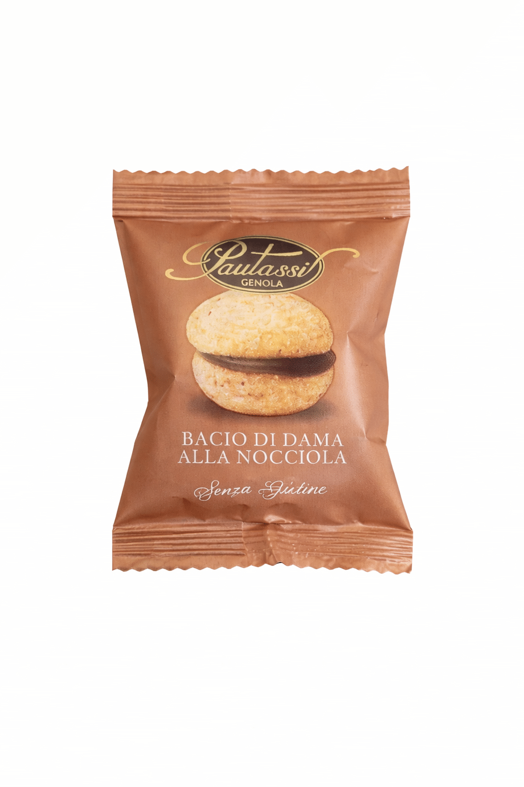 Il Bacio alla Nocciola è un raffinato biscotto della tradizione piemontese, composto da due semisfere friabili unite da un sottile strato di cioccolato fondente. La frolla è realizzata con il 20% di nocciole, zucchero, burro e un mix di farine naturalmente prive di glutine, conferendo una consistenza delicata e un gusto autentico. Il ripieno di cioccolato fondente (minimo 60% di cacao) aggiunge una nota intensa e persistente, creando un equilibrio armonioso tra dolcezza e aromaticità. Prodotto artigianalmente, è adatto anche a chi segue una dieta senza glutine.