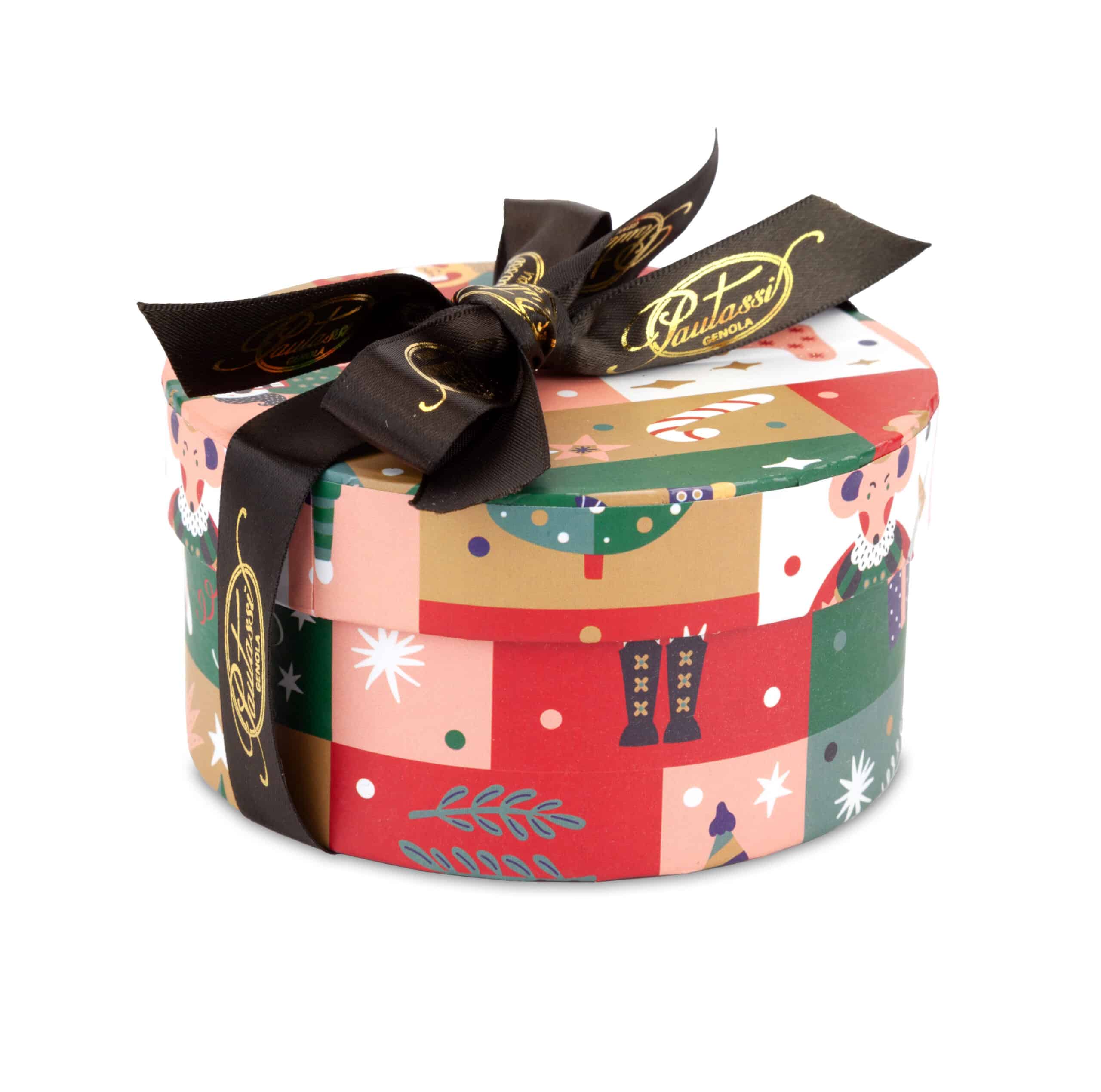 Un’elegante scatola cilindrica verde, impreziosita da dettagli natalizi e completata dal nastro Pautassi in raso nero e oro. Una confezione raffinata, ideale per un regalo che unisce tradizione e piacere gourmet.