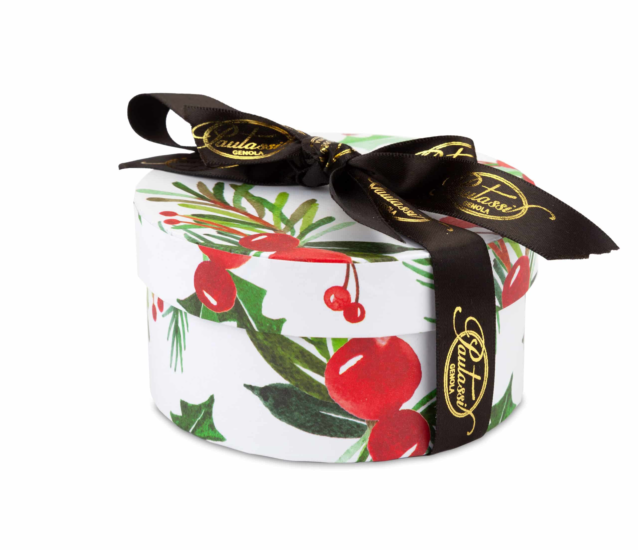 Un’elegante scatola cilindrica a tema natalizio, decorata con delicati motivi invernali e rifinita dall’inconfondibile nastro Pautassi in raso nero e oro. Un gesto raffinato, perfetto per un dono di autentica dolcezza.